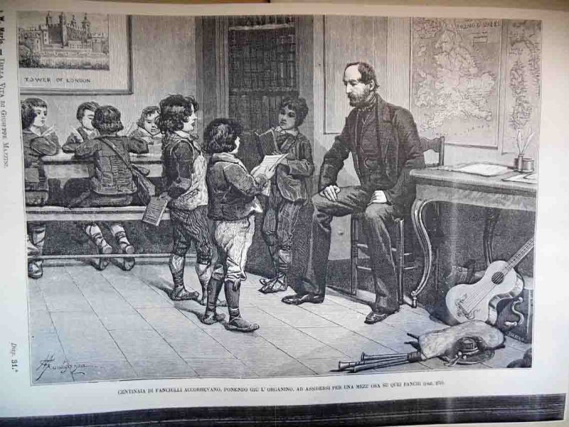 E questi bimbi malfamati sporchi e laceri per le vie di Londra rappresentavano un motivo di continua umiliazione e cruccio per quelli che volevano notarli. E uno fu Giuseppe Mazzini, il grande patriota italiano per molti anni in esilio a Londra, che unico e solo e per primo si occupò fattivamente di questa infelice umanità abbandonata, preda dello sfruttamento e della disperazione, con le sue parole: “in uno stato di assoluta barbarie”. Non pochi dei cosiddetti ‘padroni’ portò davanti al Giudice ma capì che l’unica arma possibile per un riscatto autentico e per l’affrancamento erano l’istruzione, la cultura, con le sue parole: “assecondare e innalzare quelle rozze menti, intorpidite dalla miseria e dalla abbietta soggezione ad altri uomini”. E quindi a costo di ulteriori rinunce personali e con il sostegno di personaggi inglesi della cultura e dell’arte fondò una scuola per questi bambini ma anche per gli adulti, che venne aperta il 10 novembre1841, data memorabile nella storia della emigrazione italiana soprattutto e principalmente ciociara.