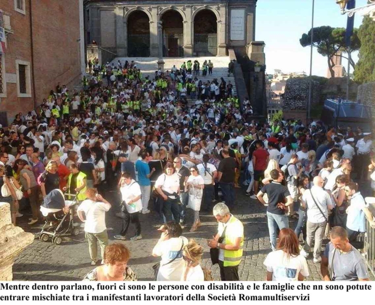 Messaggio di invito a partecipare postato su fb anche dal Presidente Fish Lazio Dino Barlaam e dai politici deputati al sociale. Nonostante l’invito a collaborare e presenziare, le molte persone con disabilità e rispettive famiglie, non sono potute entrare e dopo aver raggiunto a fatica il Colle del Campidoglio alle ore 16.00, quelle più calde di un pomeriggio assolato, sono dovute restare fuori ai piedi delle scale all’ingresso principale, in compagnia di vigili, polizia e messi comunali, senza poter entrare perché erano finiti i pass. "Nessun politico si è scomodato per scusarsi dell’inconveniente. - commenta Roberta Sibaud vice presidente dell'associazione Donne per la Sicurezza Onlus - Caso strano per i guru del terzo settore, - prosegue Sibaud - c’era una lista VIP all’ingresso. Non solo, all’interno dell’aula è stata data la parola solo alle coop, agli enti accreditati e perfino la Consulta Cittadina (inesistente) e la Federazione FISH (e tutte le Associazioni confederate che sostengono la Fish) sono state rappresentate da un ex consigliere comunale (due mandati) gestore di 4 case famiglia e portavoce delle circa 56 RSA H. - Sibaud prosegue - Nessuno si è degnato di salutarci pubblicamente ad eccezione della consigliera comunale Gemma Azuni che lo ha fatto pubblicamente ed ha comunicato ai colleghi la nostra presenza in aula. Noi persone con disabilità e le famiglie non abbiamo avuto il “diritto di parola”. Ci sentiamo ancora una volta usati ed umiliati, cosa ormai consona anche nelle “riunioni” visto che per gli incarichi riservati alle persone con disabilità si preferiscono persone “normodotate giovani belli e massimo 30/35 anni”. I Consiglieri della maggioranza che si occupano di sociale non ci hanno voluto far parlare hanno preferito dare voce alle cooperative… forse perché qualcuno ci lavora ancora, visto che in rete sono stati pubblicati i compensi che percepiscono… conflitti a gogò!