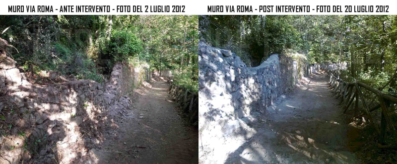 • Nel ripristino di parti del muro di confine posto sulla parte destra a salire di via Roma (Foto allegata: MURO VIA ROMA ANTE E POST INTERVENTO). L’intervento ha interessato circa 30/35 ripristini di parti del muro che già in un remoto passato erano stati previsti come via di sfogo delle acque meteoriche provenienti dal costone sovrastante. Il muro in questione, negli ultimi 50 anni, non è stato oggetto di nessun intervento di manutenzione;