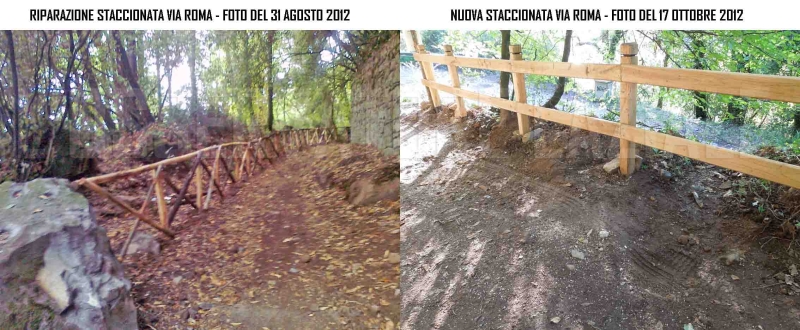• Nella riparazione ed in parte sostituzione della staccionata in pali di castagno posta a protezione della parte sinistra a salire di via Roma (foto allegata: RIPARAZIONE STACCIONATA e Nuova staccionata via Roma). Gli interventi hanno interessato circa il 20% del totale della staccionata. Nel primo tratto (20/30 metri) la staccionata è stata costruita ex novo con travetti di castagno squadrati fissati con viti ottonate: nel resto del tracciato sono stati sostituiti i paletti e le filagne più deteriorate;