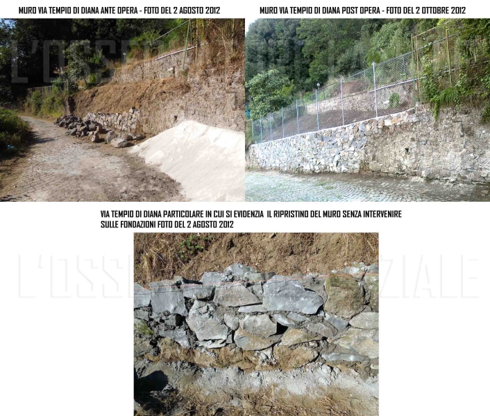 • Nella ricostruzione parziale del muro di confine della proprietà lungo via del Tempio di Diana civico 2. (foto allegata: MURO DIANA ANTE E POST OPERA). Non si è proceduto al consolidamento del versante ed il ripristino è stato realizzato ricostruendo solamente la porzione del muro crollato (foto NO FONDAZIONE MURO DIANA).