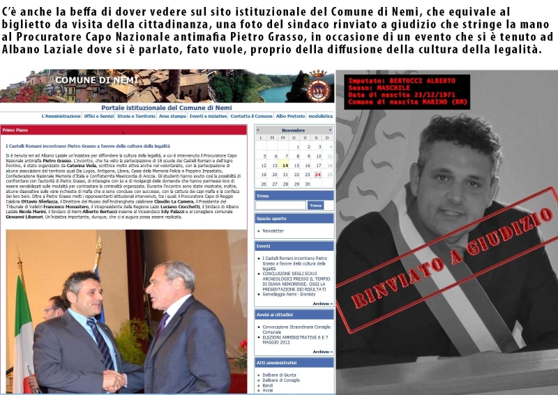 Oltre al danno e alla vergogna di avere un primo cittadino indagato e poi imputato per Turbativa d’asta e frode nei pubblici incanti e un vigile urbano anch’esso indagato e imputato in un processo con l’accusa di soppressione, distruzione e occultamento di atti veri, c’è anche la beffa di dover vedere sul sito istituzionale del Comune di Nemi, che equivale al biglietto da visita della cittadinanza, una foto del sindaco rinviato a giudizio che stringe la mano al Procuratore Capo Nazionale antimafia Pietro Grasso, in occasione di un evento che si è tenuto ad Albano Laziale dove si è parlato, sempre fato vuole, proprio della diffusione della cultura della legalità.