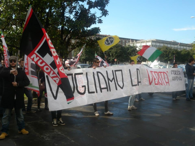 21/11/2013 ROMA, FORZA NUOVA ED EX GIOSTRAI SOTTO GLI UFFICI DI EUR SPA: " VOGLIAMO LA VERITA' SUL LUNEUR"